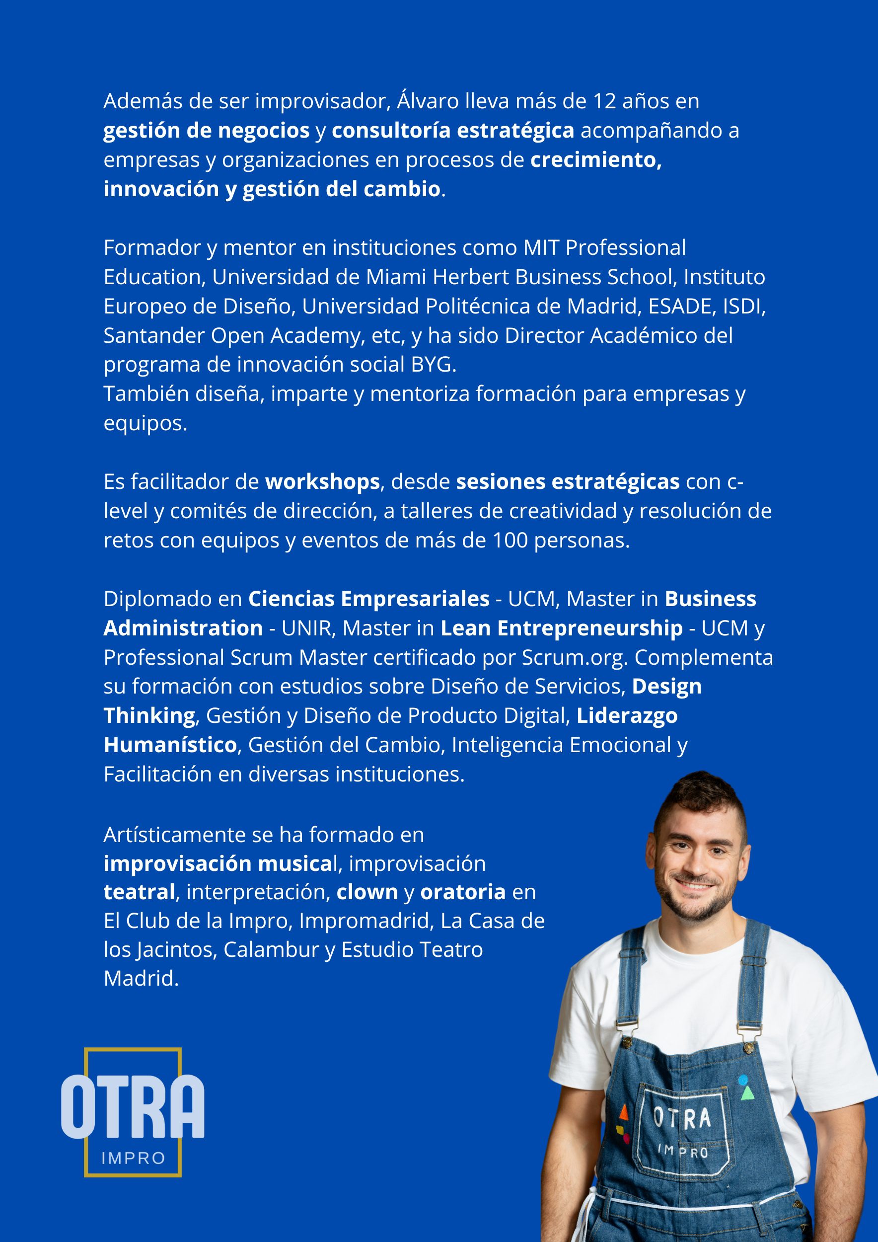 Álvaro combina improvisación de teatro musical con teatral y disimula su clown para trabajar con empresas en procesos de innovación y cambio cultural.