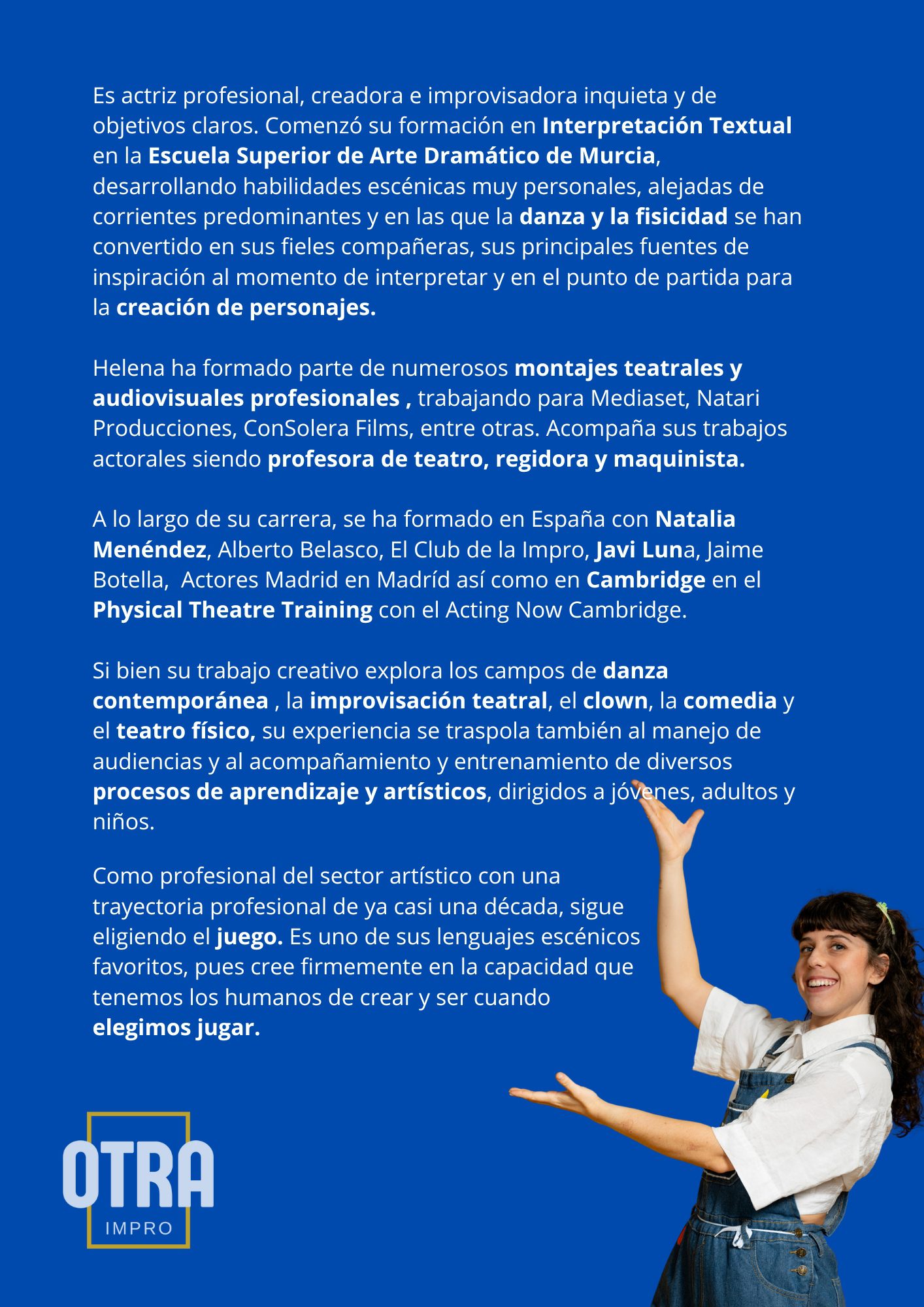 Licenciada en Arte Dramático Textual por la ESAD de Murcia, Helena es una actriz de amplia trayectoria. Se pasa la vida acercando el teatro a innumerables ciudades del país.
