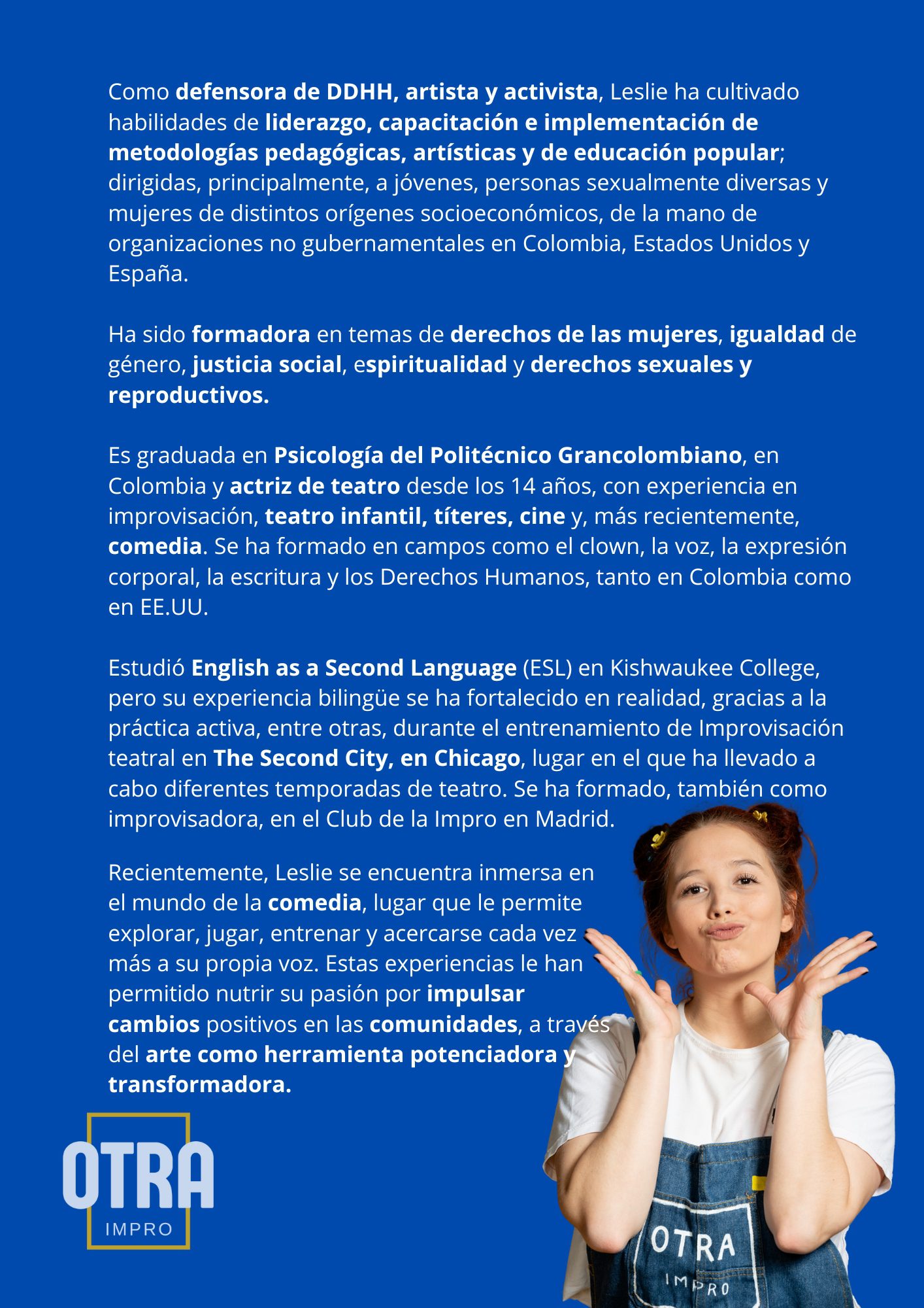 Egresada de The Second City en Chicago y Psicóloga. Leslie es comediante, actriz de teatro, títeres, cine e improvisación. Colombiana, bilingüe y una apasionada por todo lo que involucre estar encima de un escenario.
